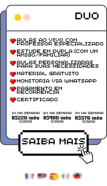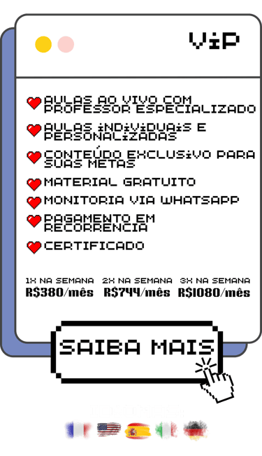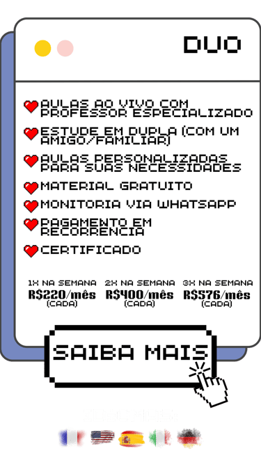 Toda semana você participa de uma aula ao vivo de 1h30, em turma reduzida, focada na prática de conversação e no uso real do idioma.